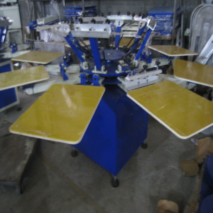 此印花机可印纸、薄膜、服装裁片等,还可印成衣,一机多用,设计精巧、美观,是中小型印花厂理想的设备双层轮转--印台和网板双层轮转,可使四色/六色/八色套印连续运行,且印台转动使热处理过与印花同步进行,提高生产效率和成品率。